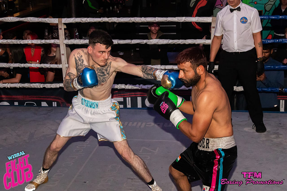 Wrexham’s Scott ‘Lefty’ Kearns, who was also making his pro debut, was next in action against tough Indian bruiser Bhinder Singh (1-4-0), and just like the previous Bramhall versus Spencer was a full on closely fought war for the full four rounds. Referee Adrian Thorne scored in favour of Kearns by a 40-37 points margin.